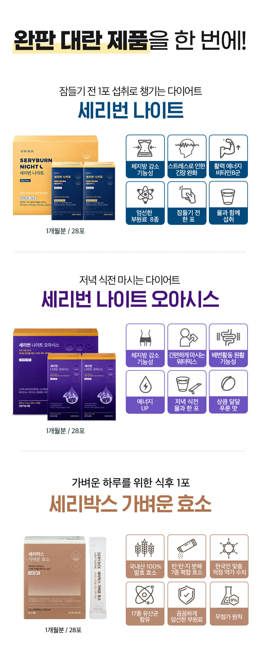 | 제품명 | 트리플 오아 나이트 패키지 1개월 구성상품 : 세리번 데이 트리플 + 세리번 나이트 + 세리번 나이트 오아시스 |
