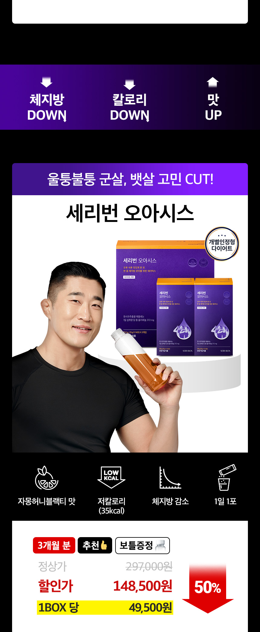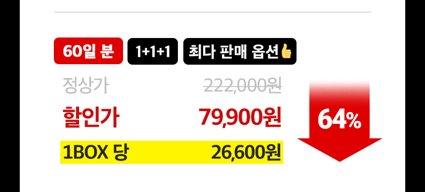 1일 섭취량 당, 열량 10 kcal, 탄수화물 3 g(1%), 단백질 0 g(0%), 지방 0 g(0%), 나트륨 5 mg(0%), 총(-)-Hydroxycitric acid 800 mg, 카테킨 300 mg, 실리마린 130 mg, 옥타코사놀 7 mg, 비타민B1 2.4 mg(200%), 비타민B2 2.8 mg(200%), 비타민B6 3 mg(200%), 나이아신 30 mg NE(200%), 판토텐산 10 mg(200%), 비타민C 200 mg(200%), 아연 17 mg(200%) |